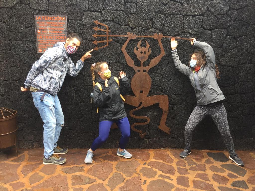 Nico, Me, and Rocio posing with El Diablo at Timanfaya National Park in Lanzarote
