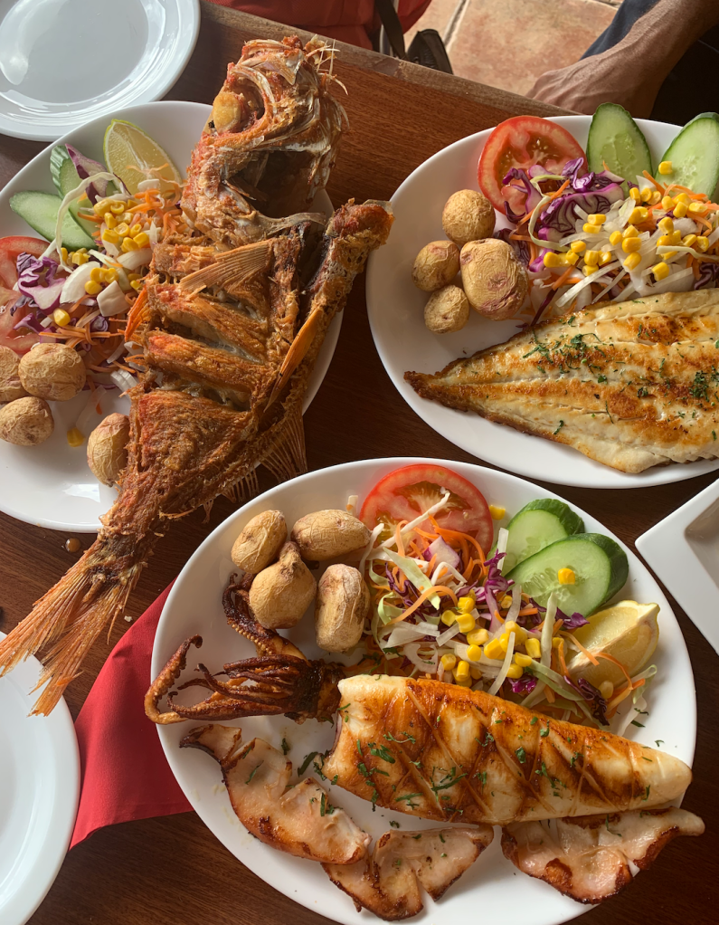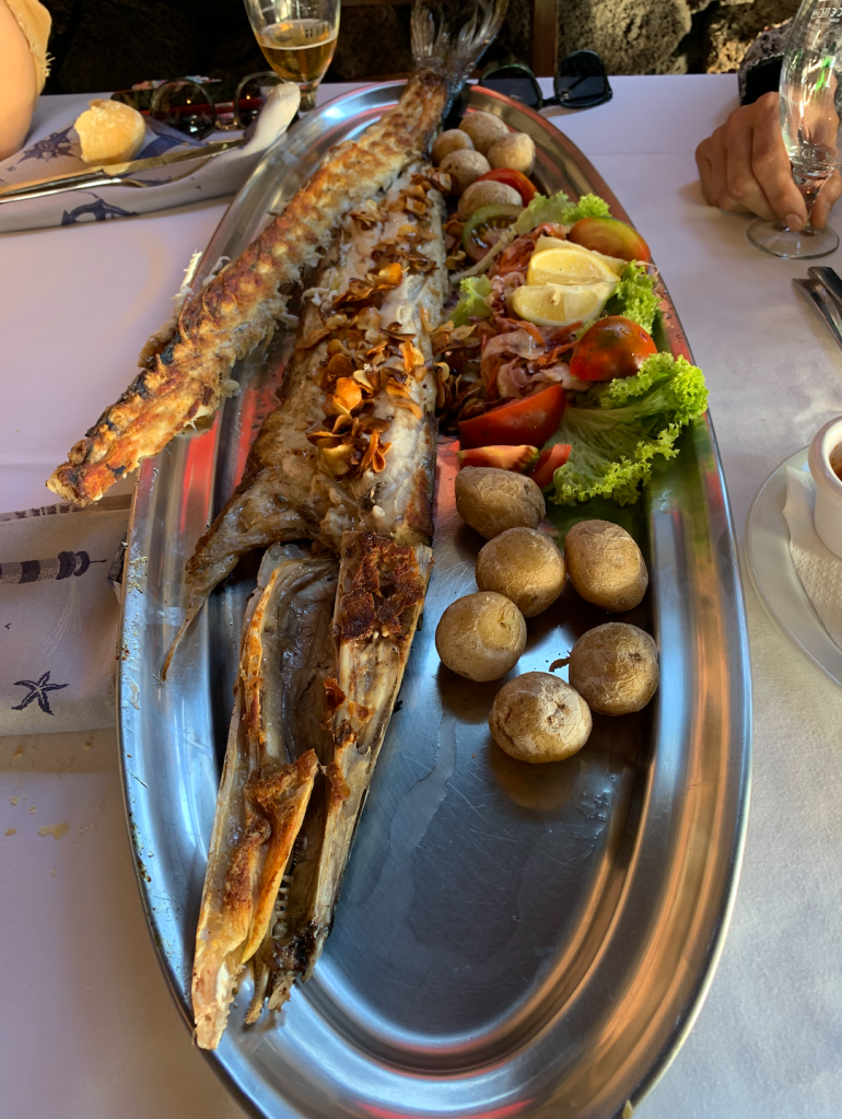 You can not go to the Canary Islands without indulging in their delicious seafood. Fish & octopus are popular menu items. If you are like me, and you don’t know much about the differences between fish, you can request the “fish of the day” to share among your table. Usually, this is served with papas arrugadas and salad. Fish can be served various ways; “a la plancha” (grilled) “frito” (fried). Pictured on the right, is Barracuda, one of the more unique dishes I’ve tried… and very delicious!