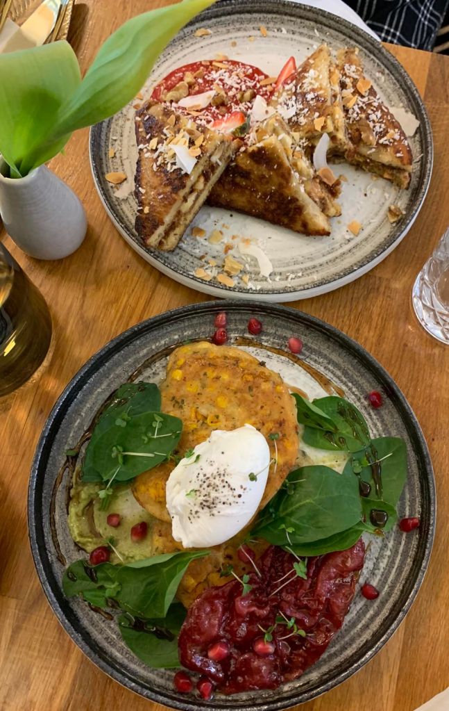 We shared the corn fritters (chef’s kiss) and strawberry peanut butter French toast. My latte was the size of my face.