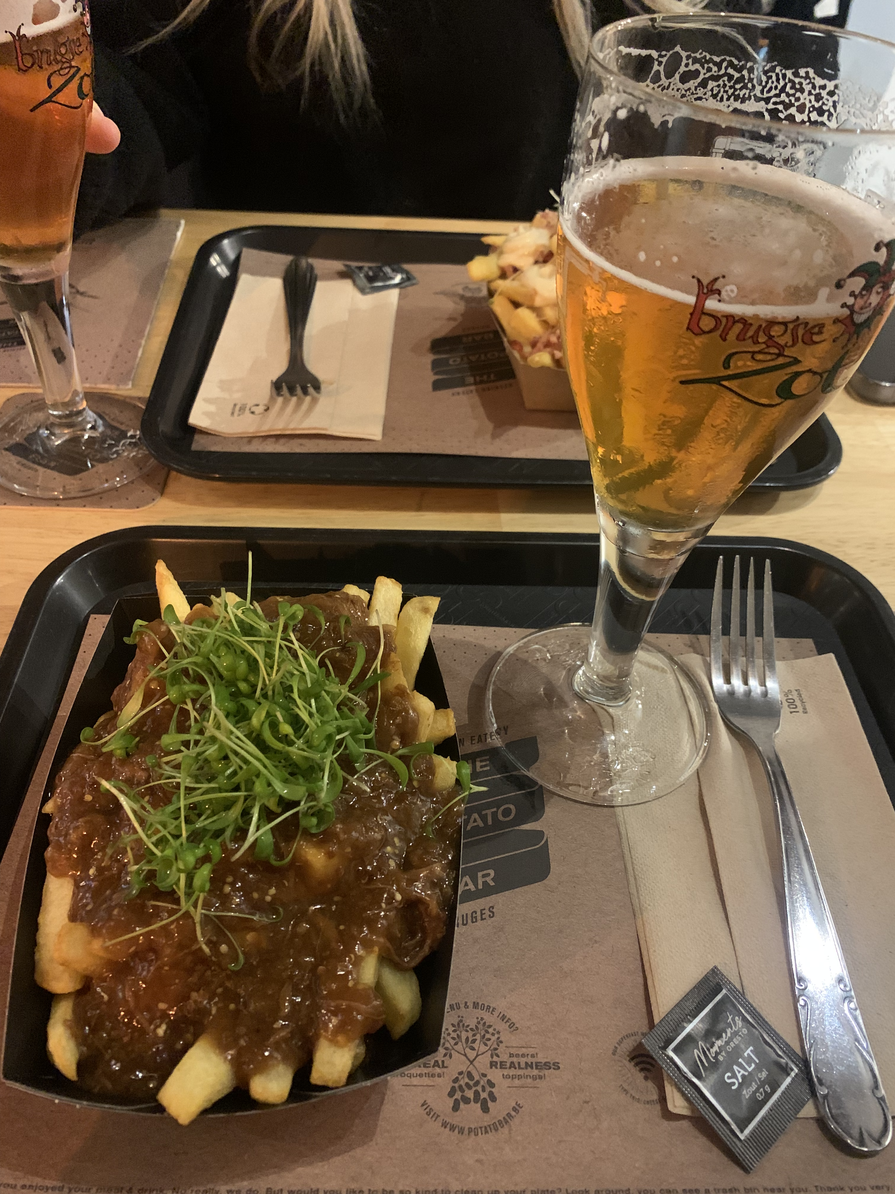 I met up with my hostel roomie at Potato Bar, where we indulged in some loaded French fries and Belgian beers.